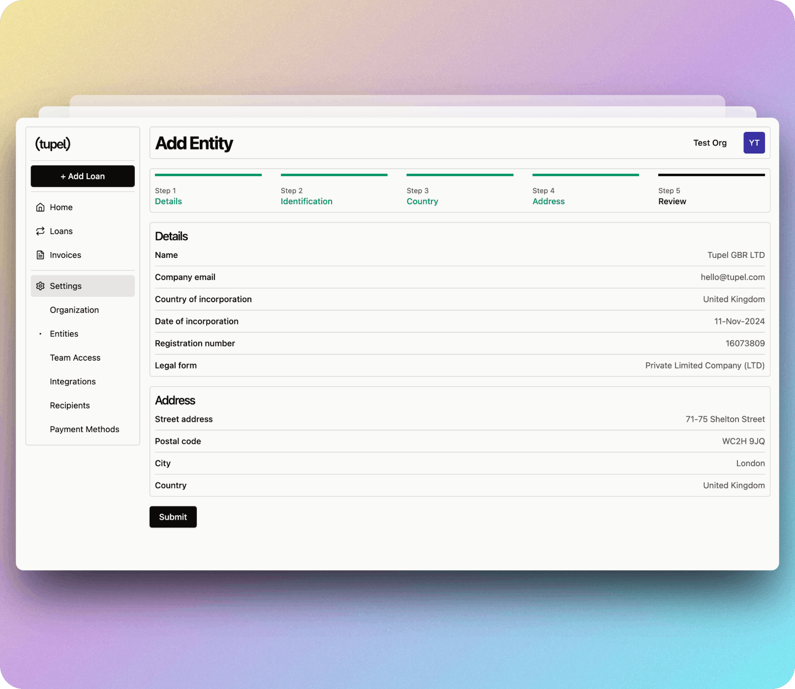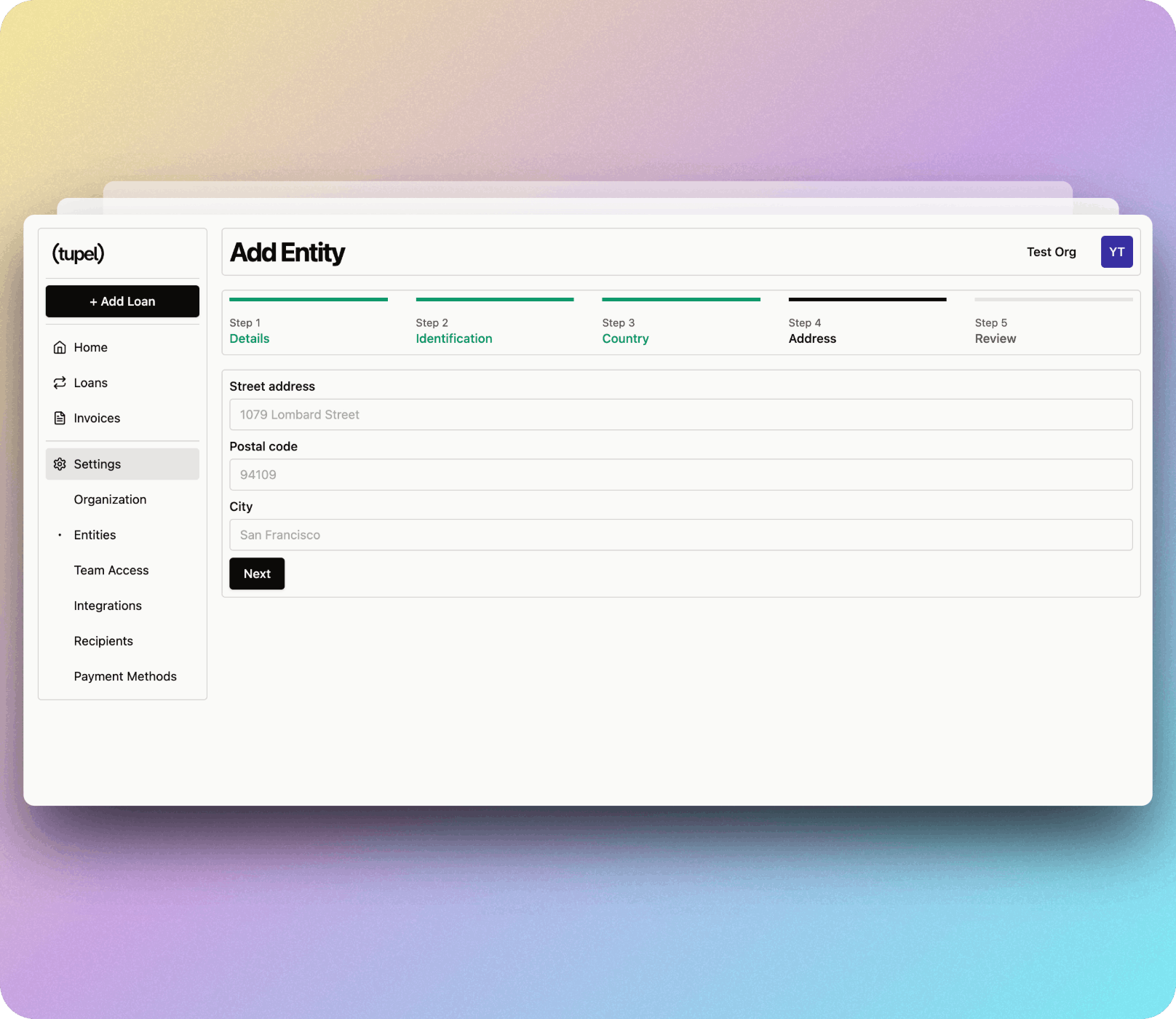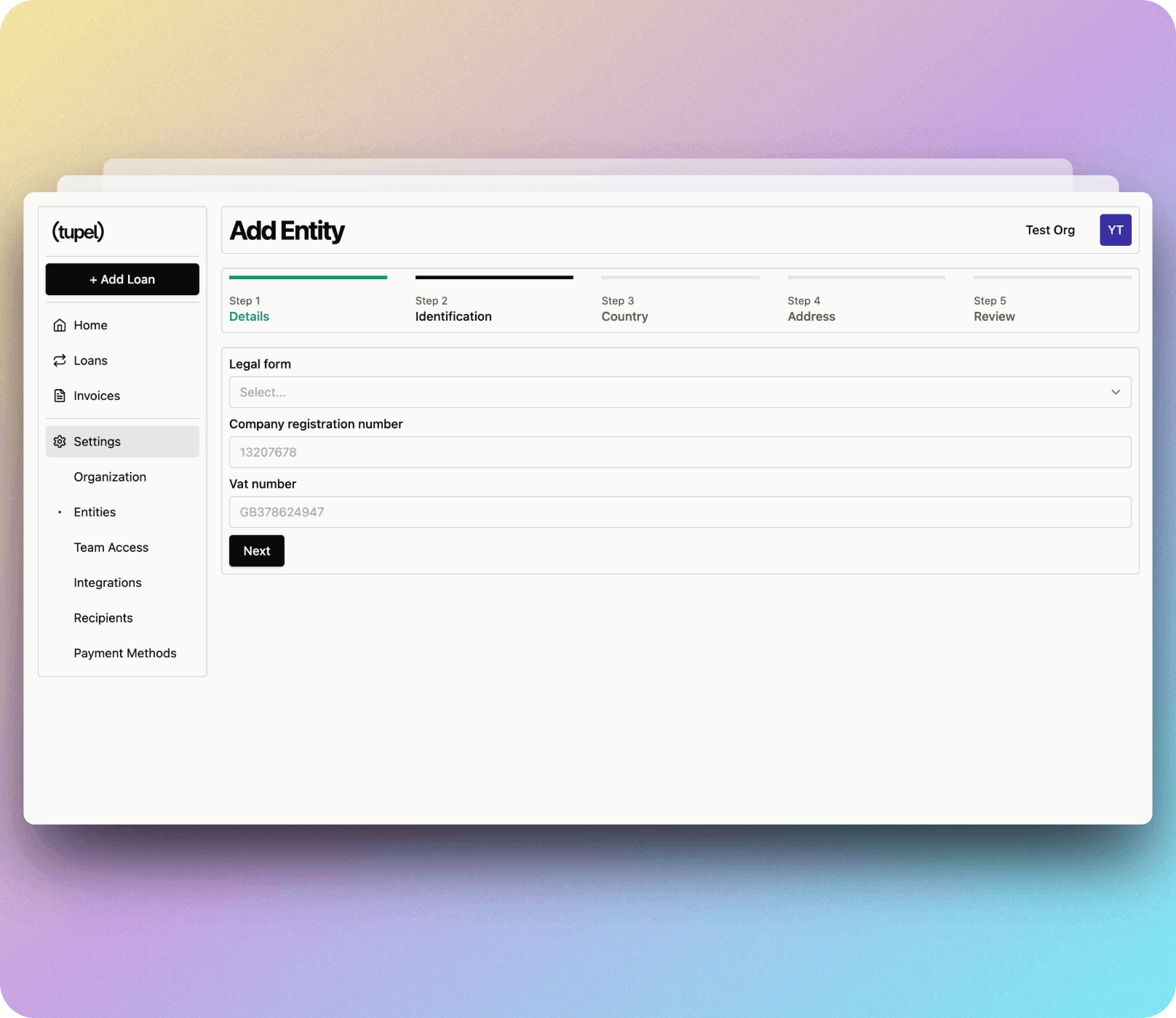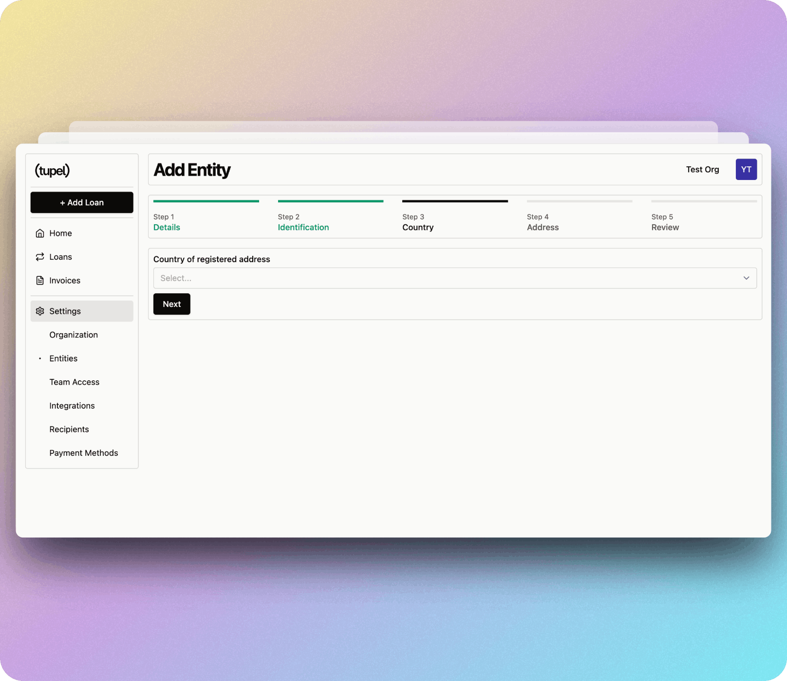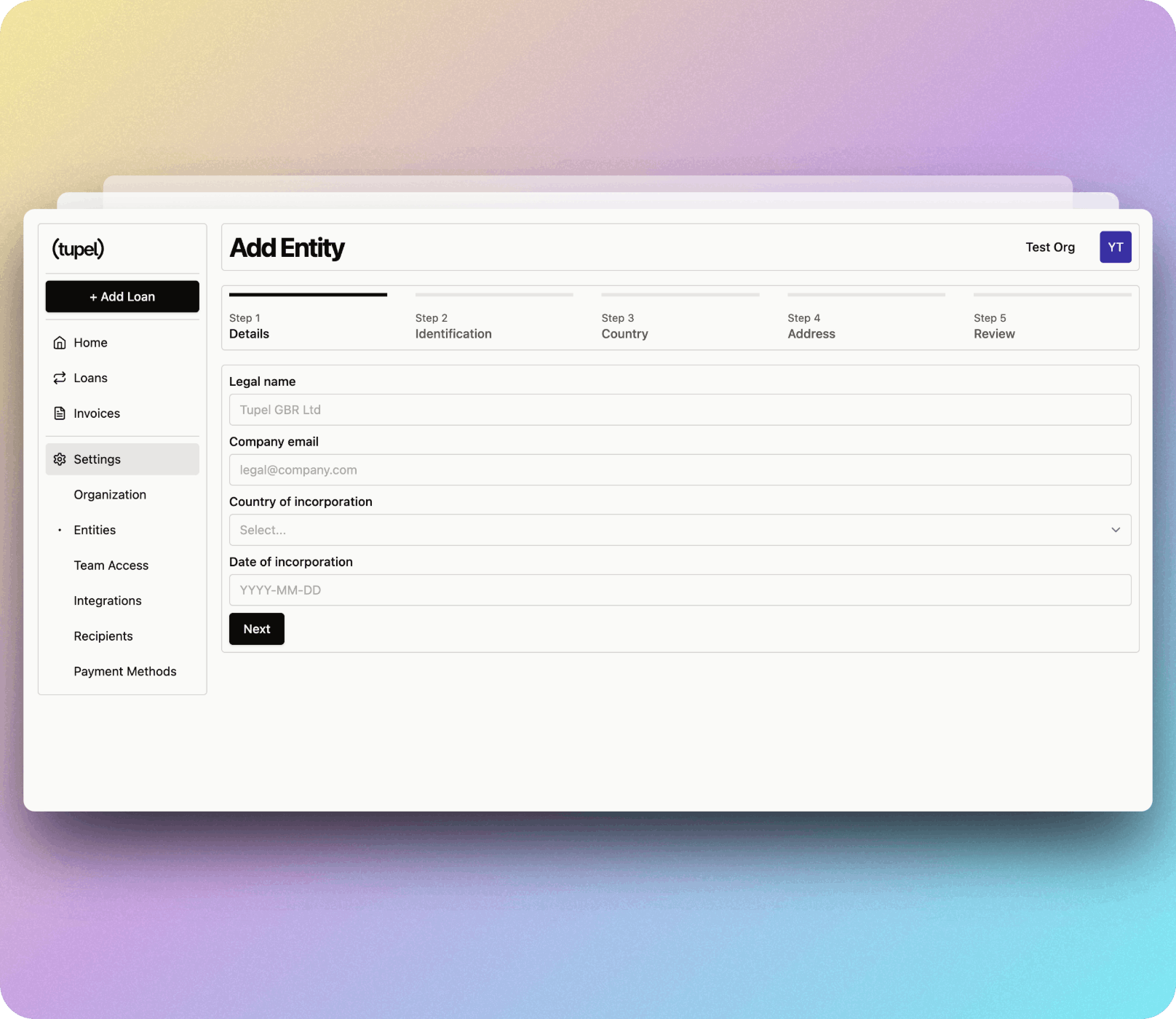 On the Add Entity page, add your entity details including the legal name, company email address and country of incorporation and finally click "Next".