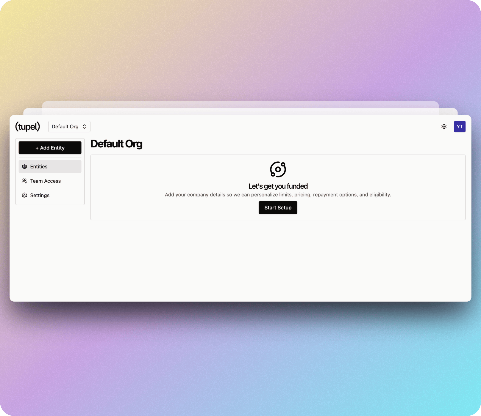 Add your business entity to Tupel to start accessing financing. An entity represents a legal business that will be borrowing funds.