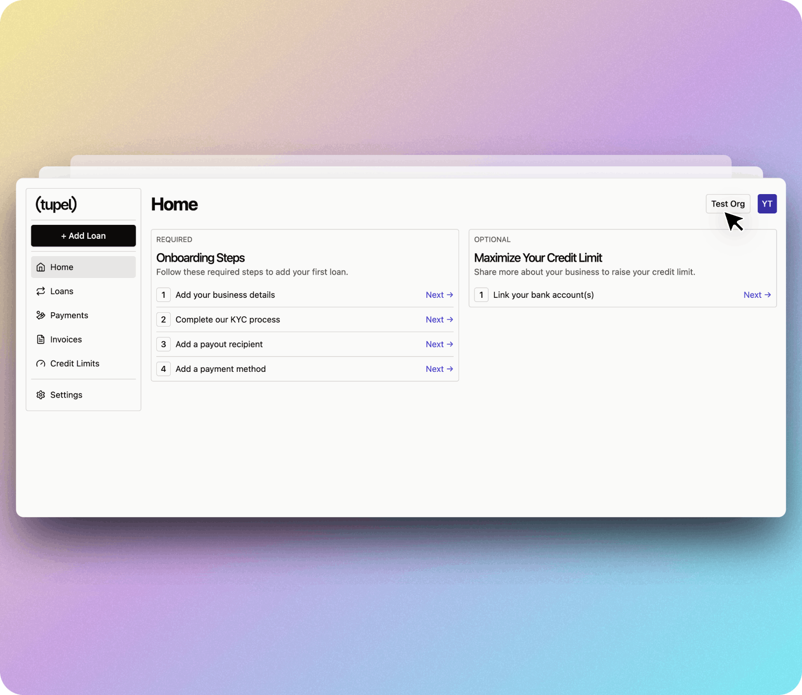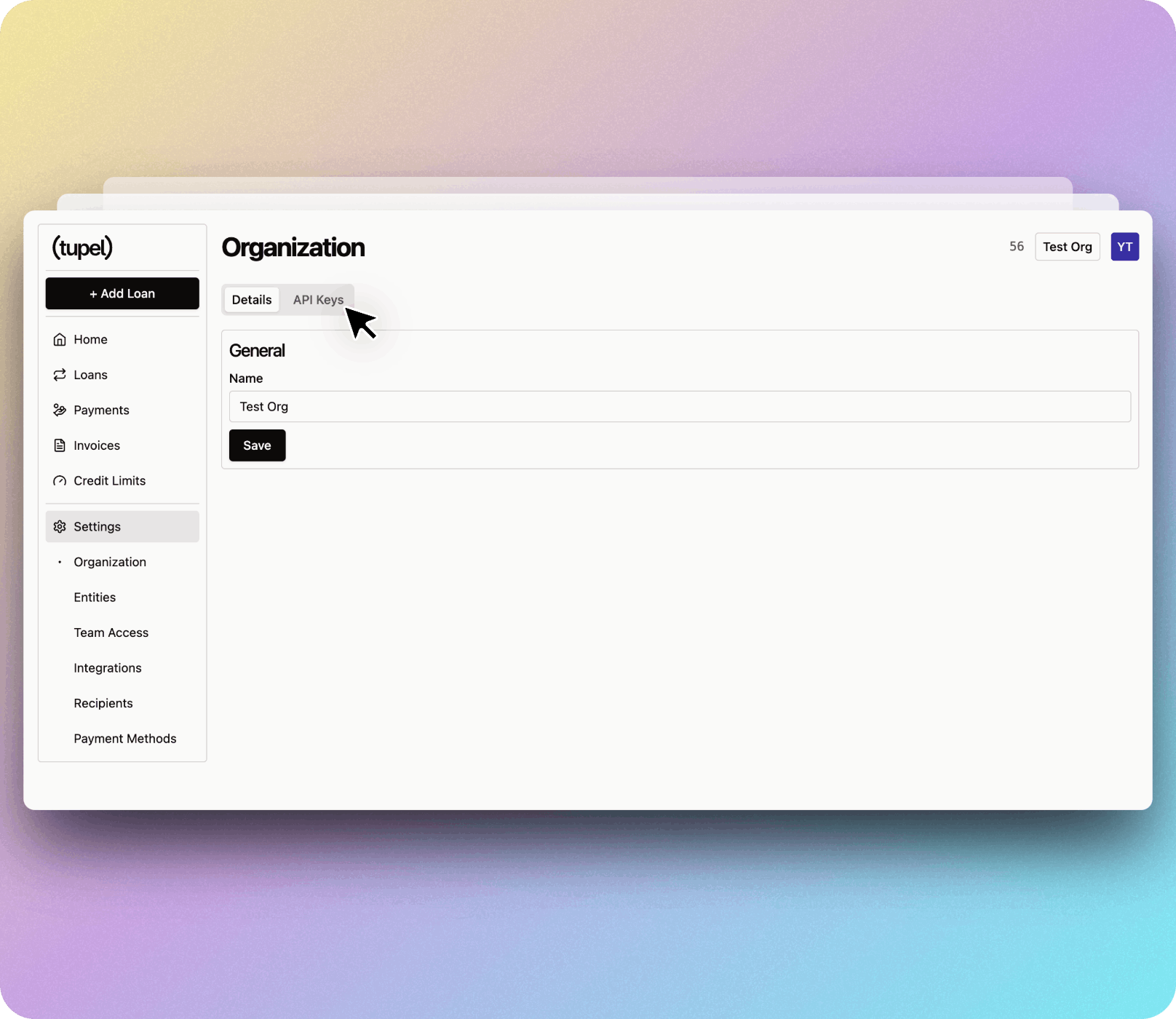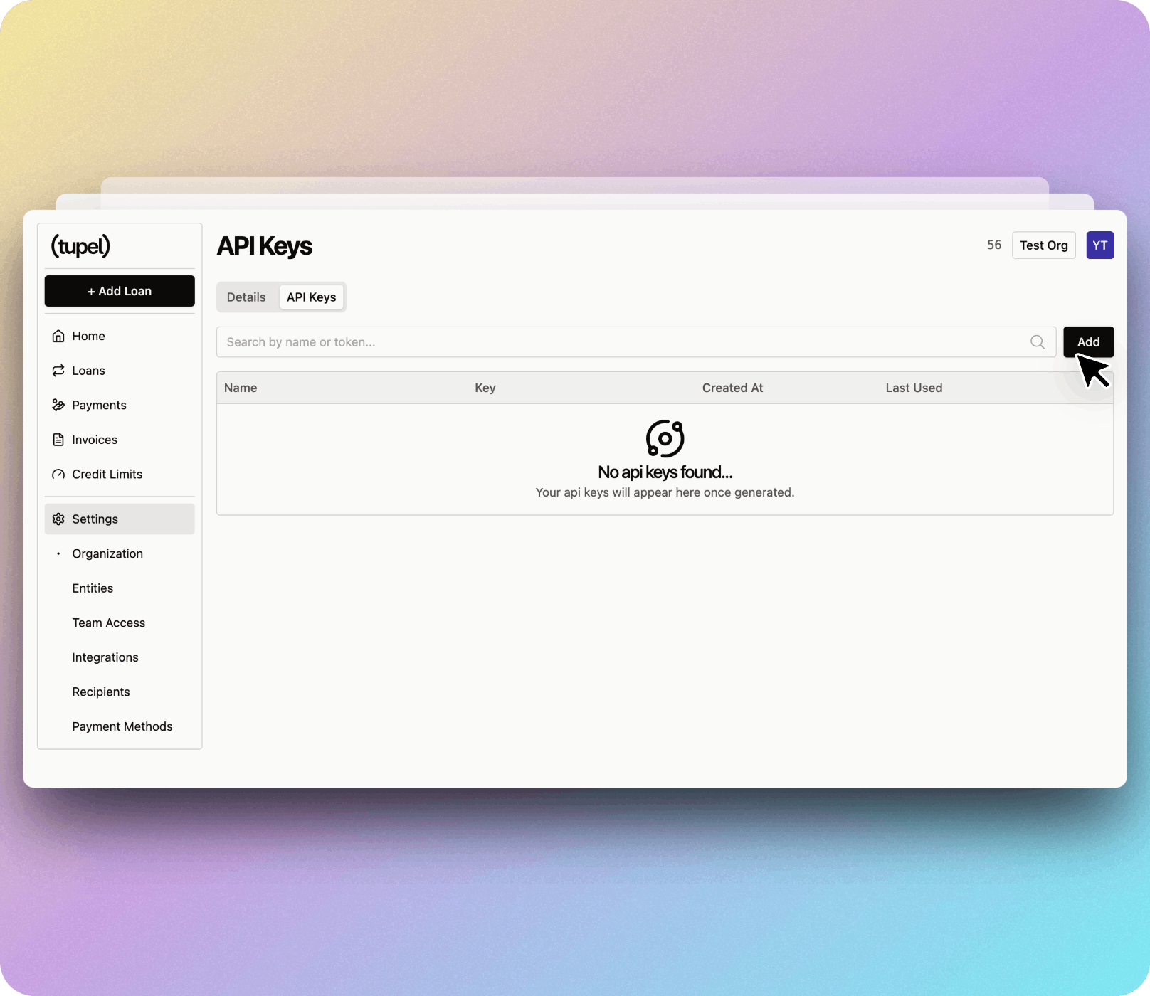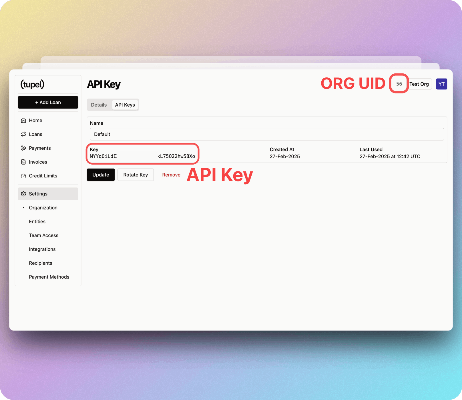 API keys allow you to securely connect your applications to Tupel's services. This guide will walk you through how to find, create, and use your API keys along with your Organization UID.