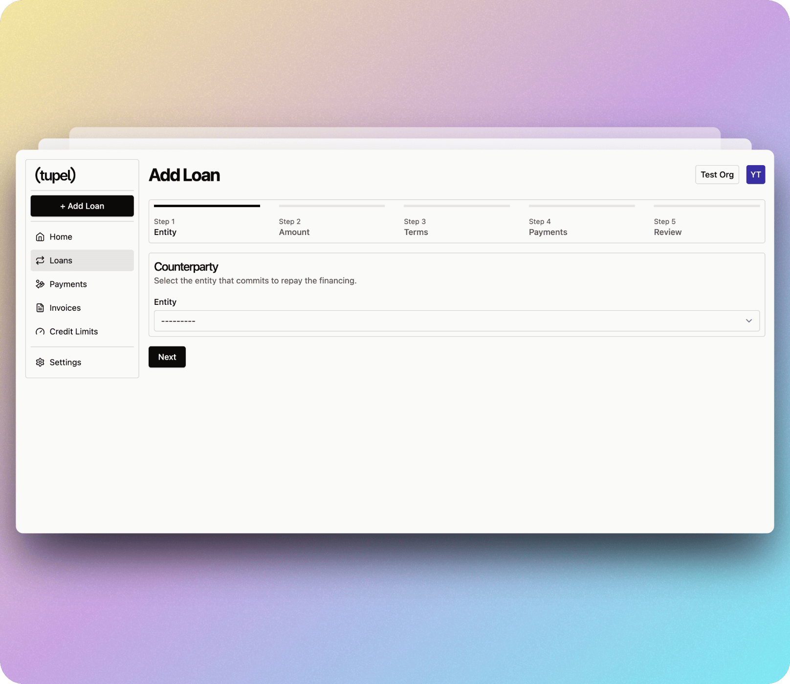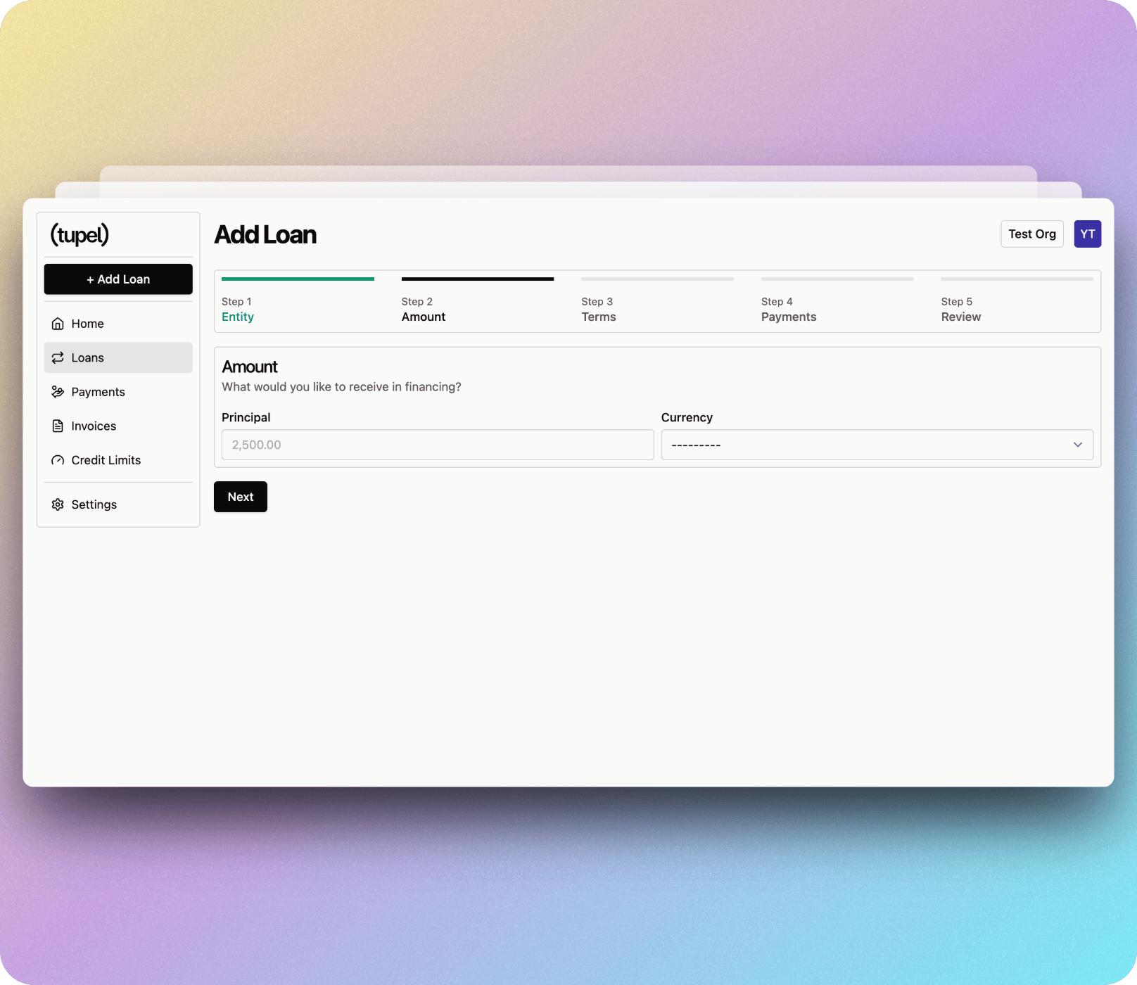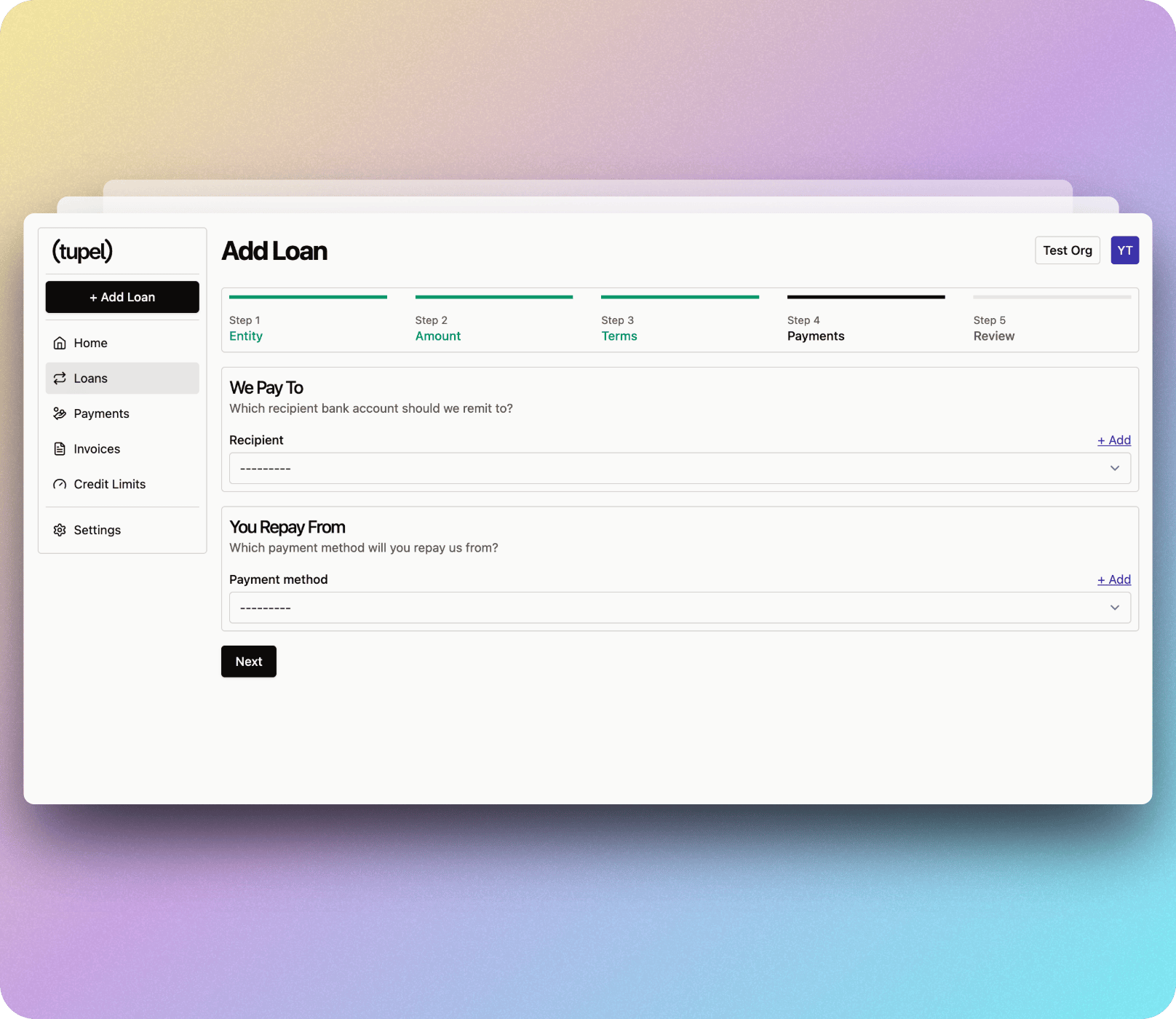 Next, tell us which "Payout Recipient" we should transfer the funds to and which "Payment Method" we should use for invoices and principal repayments.