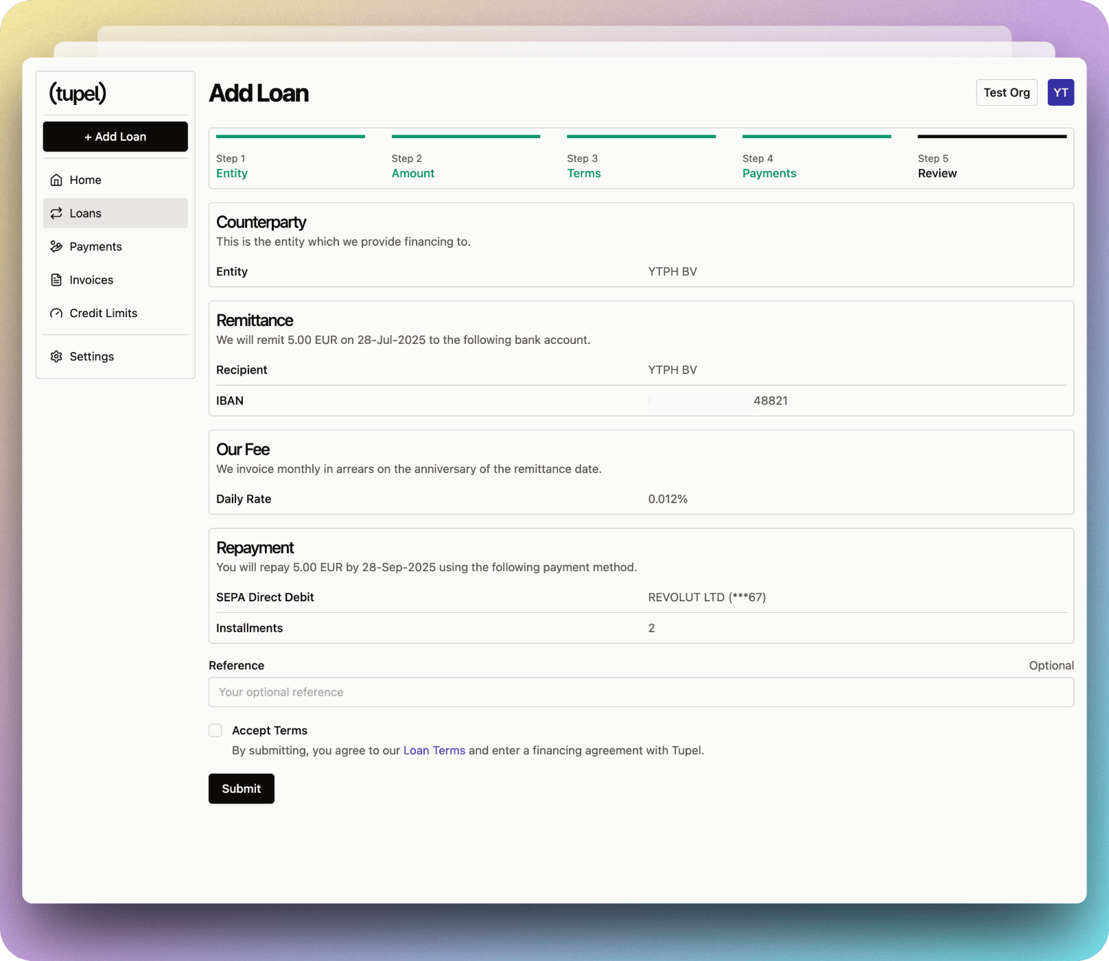 Finally, please review your details. At this point you can optionally add a "Reference" to this loan. The reference will be used when paying the principal out to the recipient account.